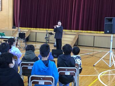 本日3時間目、文化庁による芸術派遣事業が行われました。「しの笛の魅力」という内容で、講師の方2名においでいただきました。子供たちは、きれいに響く「しの笛」の音色に、うっとりと聞き入っていました。「しの笛」の歴史について学んだり、たくさんの曲を聞かせていただいたりするなど、学びの多い時間となりました。
