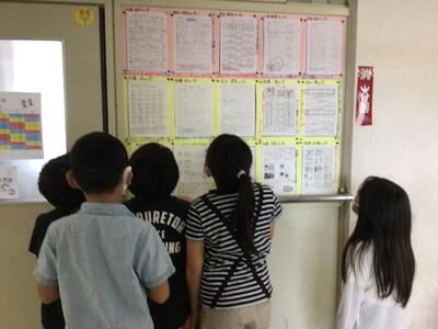 3年生が自主学習に取り組み始めました。「何を勉強したらいいのかな?」と悩んでいる子供たちもいたので,廊下に掲示したある4年生の自主学習ノートを見てみると…。意味調べ,国旗,計算,生き物調べなど,4年生の自主学習ノートは,バラエティーに富んでいてとても参考になりました。